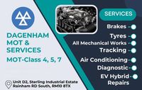 Dagenham Mot and services carries out all types of work including health check / diagnostics, services, brake pads & disc, shocks, coil springs, fluid leaks and much more. We also do tyre fitting, sizes from 14-22 inches, all tyres are fitted by professionals which include a free health tyre check example bolts, any air leaks, tpms sensors and any rim damages. ( must call us to see if we have the tyre available ).